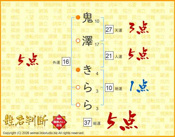 鬼(10画)澤(17画) き(4画)ら(3画)ら(3画)