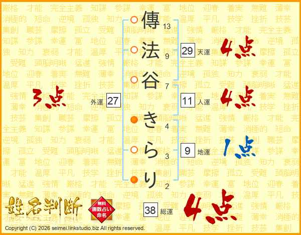 生活面を象徴する運勢です。外部から受ける影響力を表し、結婚運、家庭運や職場、環境への順応性を表します。総運から人運を引いた画数。姓や名が1文字の場合を除く。