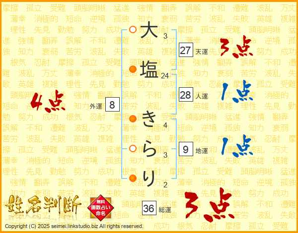 大(3画)塩(24画) き(4画)ら(3画)り(2画)