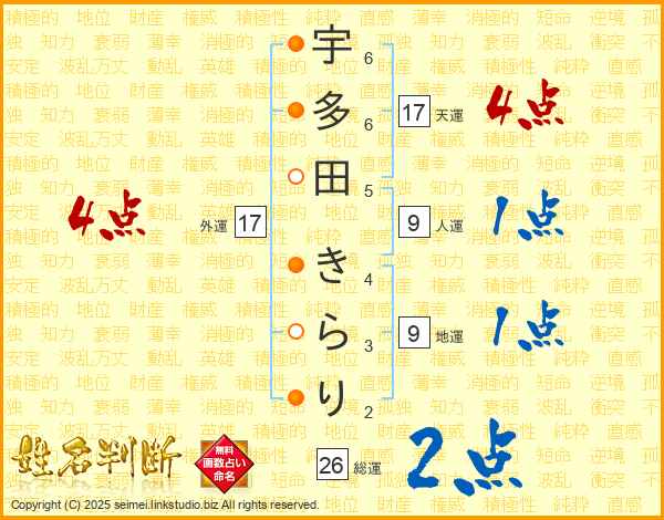 宇(6画)多(6画)田(5画) き(4画)ら(3画)り(2画)