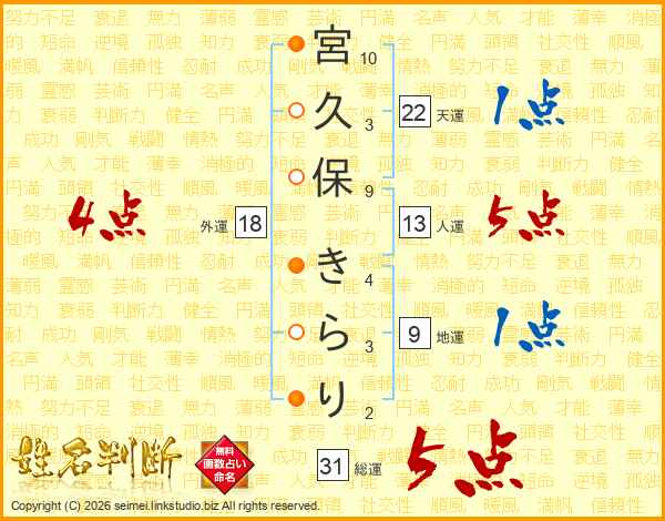 宮(10画)久(3画)保(9画) き(4画)ら(3画)り(2画)