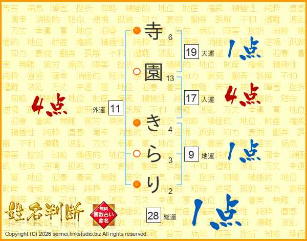 生活面を象徴する運勢です。外部から受ける影響力を表し、結婚運、家庭運や職場、環境への順応性を表します。総運から人運を引いた画数。姓や名が1文字の場合を除く。