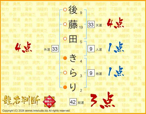 後(9画)藤(19画)田(5画) き(4画)ら(3画)り(2画)