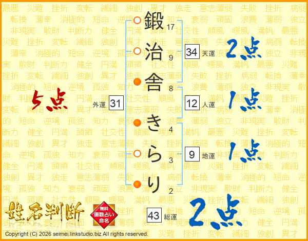 鍛治舎きらりさんの総運は43画の2点!