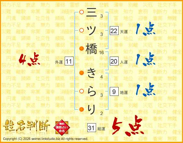 生活面を象徴する運勢です。外部から受ける影響力を表し、結婚運、家庭運や職場、環境への順応性を表します。総運から人運を引いた画数。姓や名が1文字の場合を除く。