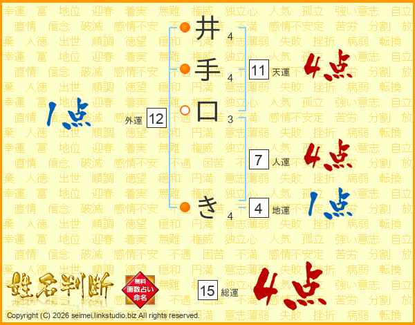生活面を象徴する運勢です。外部から受ける影響力を表し、結婚運、家庭運や職場、環境への順応性を表します。総運から人運を引いた画数。姓や名が1文字の場合を除く。