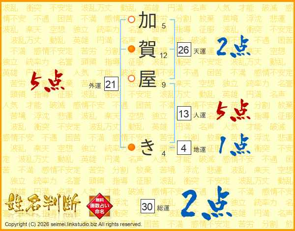加賀屋きさんの天運は26画の2点!