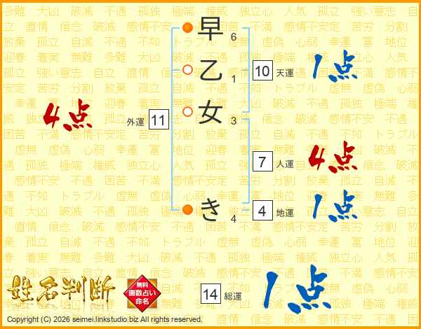 早乙女きさんの総運は14画の1点!
