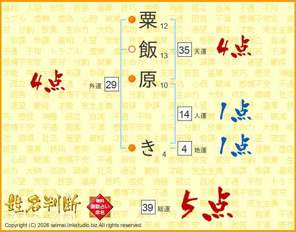 生活面を象徴する運勢です。外部から受ける影響力を表し、結婚運、家庭運や職場、環境への順応性を表します。総運から人運を引いた画数。姓や名が1文字の場合を除く。