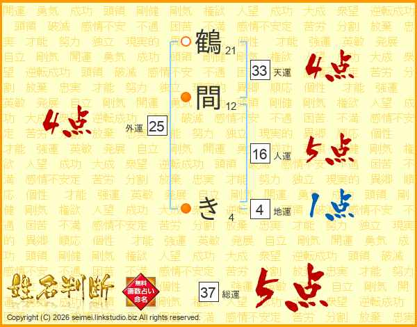 あなたの人生を表す1番重要な運勢です。生涯を通じて影響する総合運となり、主に50歳以降の晩年期に影響を及ぼします。苗字と名前の合計画数。
