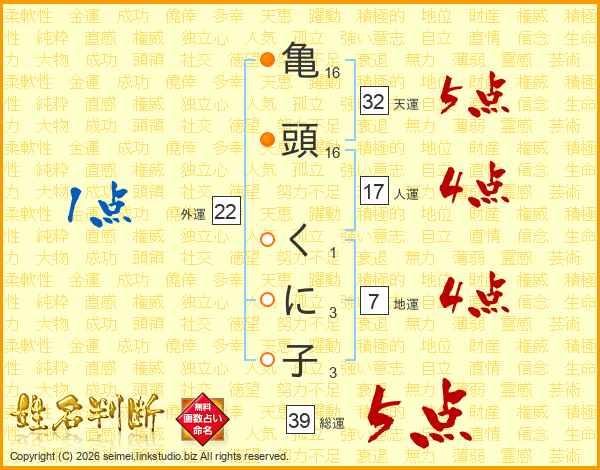 亀(16画)頭(16画) く(1画)に(3画)子(3画)