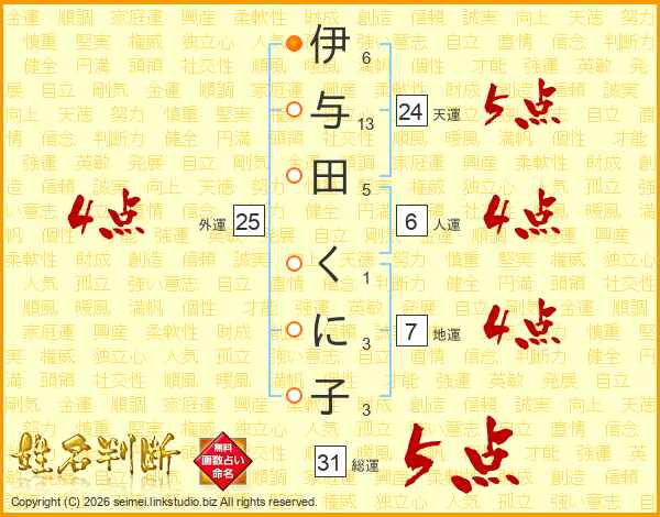 伊(6画)与(13画)田(5画) く(1画)に(3画)子(3画)