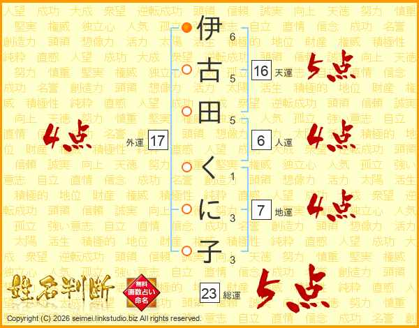 伊古田くに子さんの総運は23画の5点!