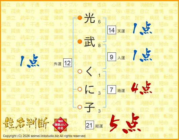 光武くに子さんの総運は21画の5点!