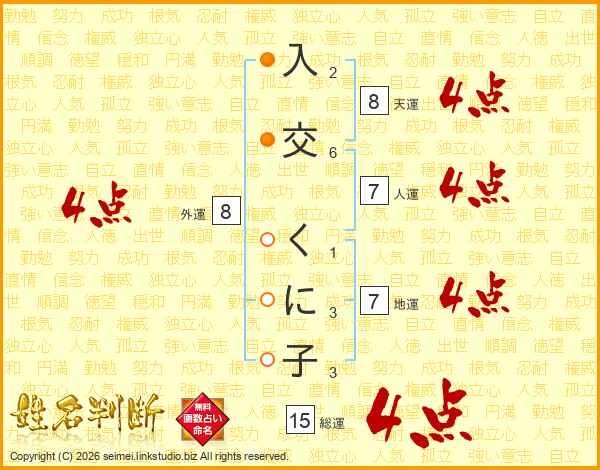 入(2画)交(6画) く(1画)に(3画)子(3画)