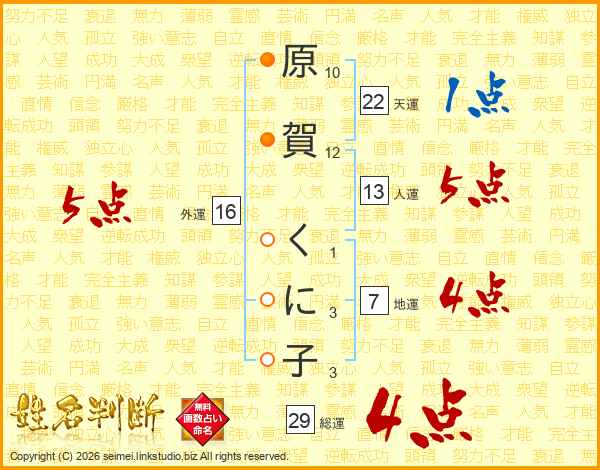 原賀くに子さんの人運は13画の5点!