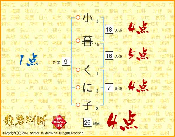 生活面を象徴する運勢です。外部から受ける影響力を表し、結婚運、家庭運や職場、環境への順応性を表します。総運から人運を引いた画数。姓や名が1文字の場合を除く。