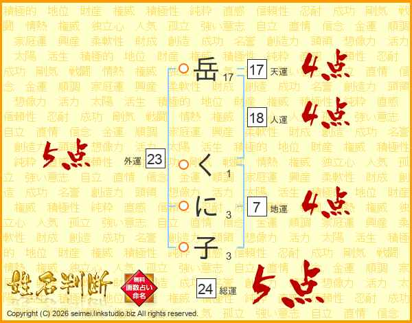 生活面を象徴する運勢です。外部から受ける影響力を表し、結婚運、家庭運や職場、環境への順応性を表します。総運から人運を引いた画数。姓や名が1文字の場合を除く。