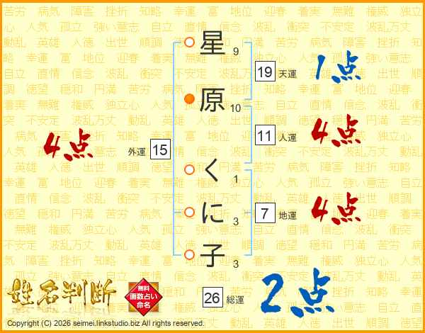 生活面を象徴する運勢です。外部から受ける影響力を表し、結婚運、家庭運や職場、環境への順応性を表します。総運から人運を引いた画数。姓や名が1文字の場合を除く。