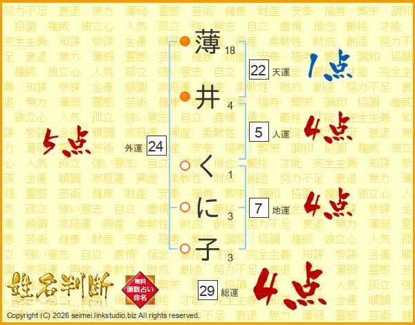 薄(18画)井(4画) く(1画)に(3画)子(3画)