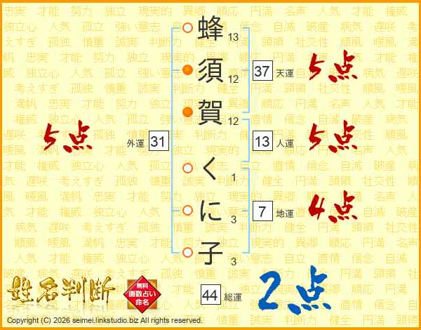 蜂(13画)須(12画)賀(12画) く(1画)に(3画)子(3画)