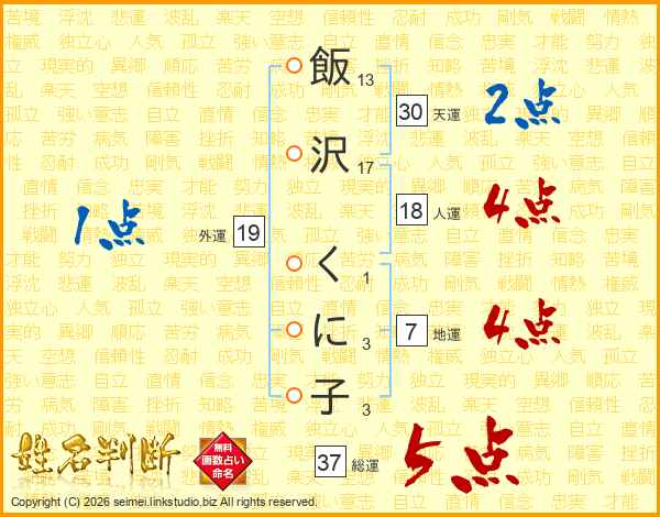 飯(13画)沢(17画) く(1画)に(3画)子(3画)