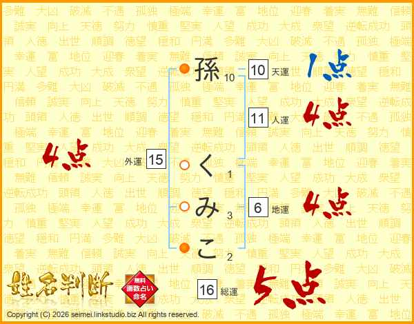 家系が持つ宿命的な運勢を表します。祖先から受け継いだ苗字ですので自分の力が及びません。家柄を象徴します。苗字の合計画数。