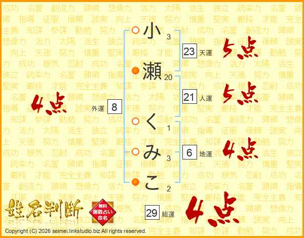 小瀬くみこさんの総運は29画の4点!