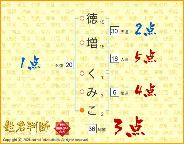 徳(15画)増(15画) く(1画)み(3画)こ(2画)