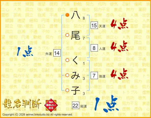 八尾くみ子さんの総運は22画の1点!