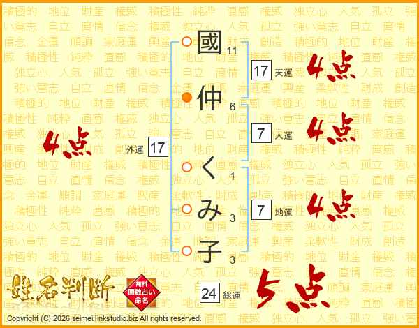 國(11画)仲(6画) く(1画)み(3画)子(3画)