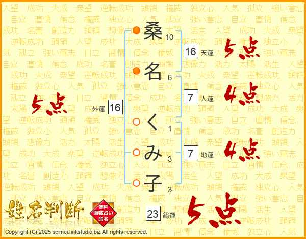 桑名くみ子さんの総運は23画の5点!