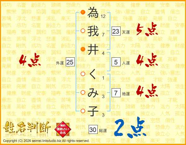 為我井くみ子さんの天運は23画の5点!