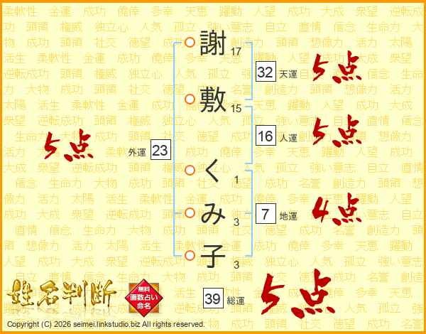 謝(17画)敷(15画) く(1画)み(3画)子(3画)