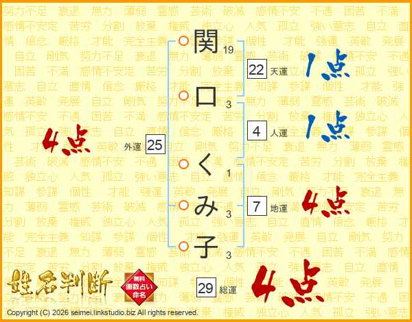 関(19画)口(3画) く(1画)み(3画)子(3画)