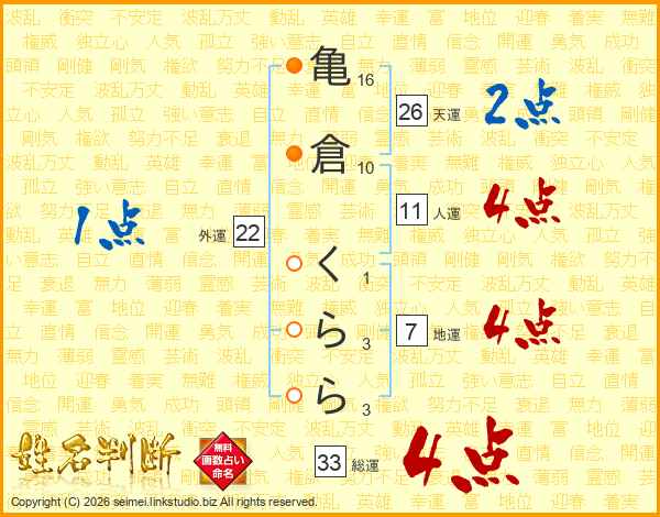 亀(16画)倉(10画) く(1画)ら(3画)ら(3画)