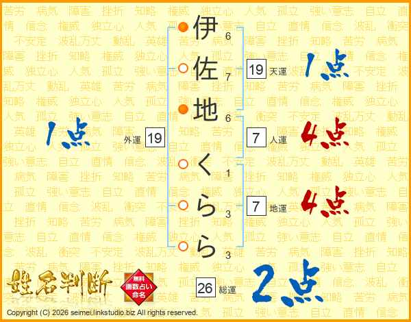 伊(6画)佐(7画)地(6画) く(1画)ら(3画)ら(3画)