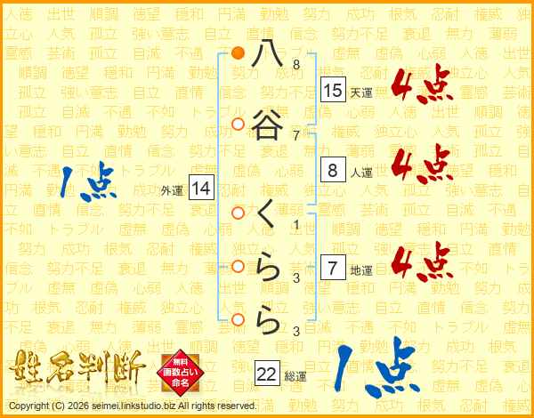 生活面を象徴する運勢です。外部から受ける影響力を表し、結婚運、家庭運や職場、環境への順応性を表します。総運から人運を引いた画数。姓や名が1文字の場合を除く。