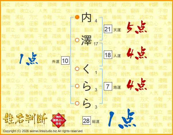 内(4画)澤(17画) く(1画)ら(3画)ら(3画)