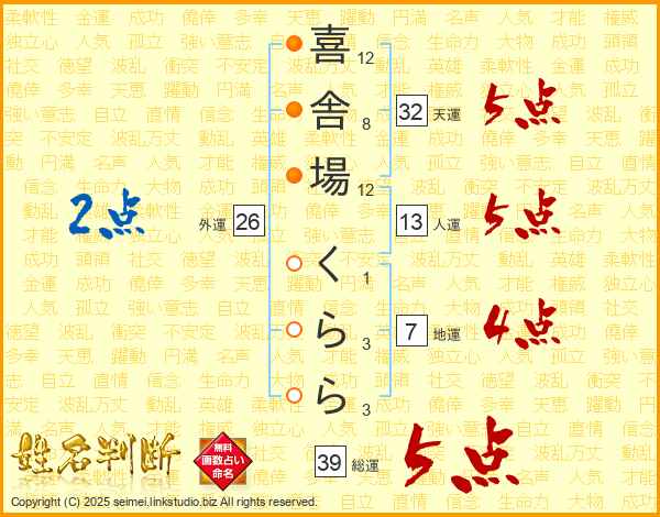 喜(12画)舎(8画)場(12画) く(1画)ら(3画)ら(3画)