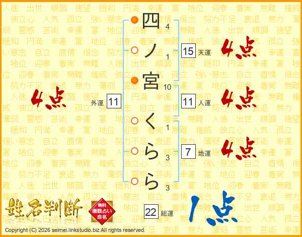 生活面を象徴する運勢です。外部から受ける影響力を表し、結婚運、家庭運や職場、環境への順応性を表します。総運から人運を引いた画数。姓や名が1文字の場合を除く。