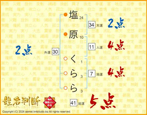 塩(24画)原(10画) く(1画)ら(3画)ら(3画)