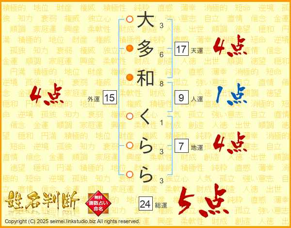 大(3画)多(6画)和(8画) く(1画)ら(3画)ら(3画)