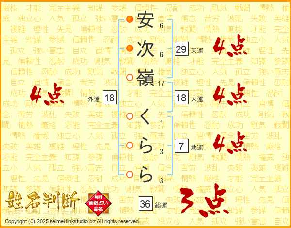 安(6画)次(6画)嶺(17画) く(1画)ら(3画)ら(3画)