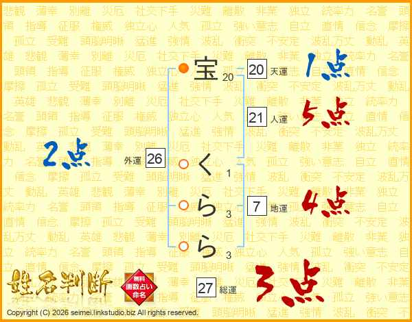 生活面を象徴する運勢です。外部から受ける影響力を表し、結婚運、家庭運や職場、環境への順応性を表します。総運から人運を引いた画数。姓や名が1文字の場合を除く。