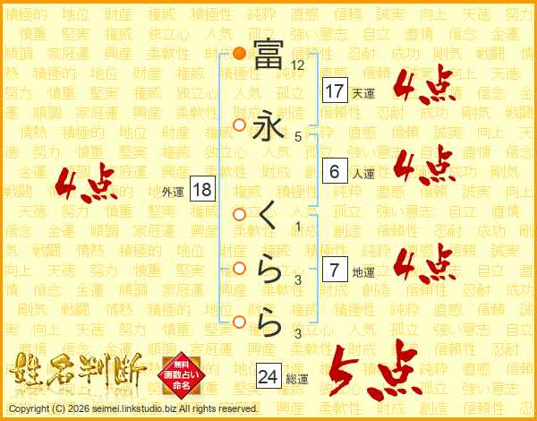 富(12画)永(5画) く(1画)ら(3画)ら(3画)