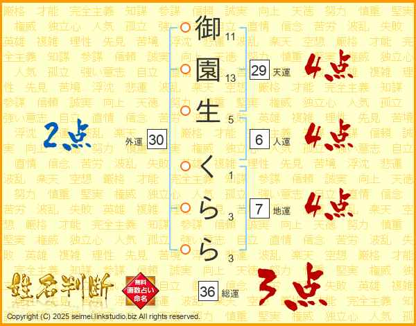 御(11画)園(13画)生(5画) く(1画)ら(3画)ら(3画)