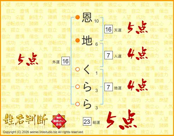 恩地くららさんの天運は16画の5点!