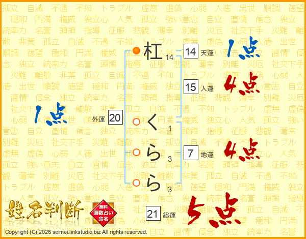 生活面を象徴する運勢です。外部から受ける影響力を表し、結婚運、家庭運や職場、環境への順応性を表します。総運から人運を引いた画数。姓や名が1文字の場合を除く。