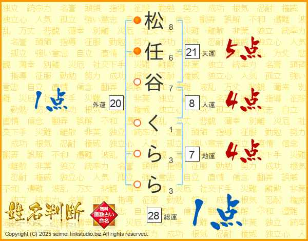 松(8画)任(6画)谷(7画) く(1画)ら(3画)ら(3画)